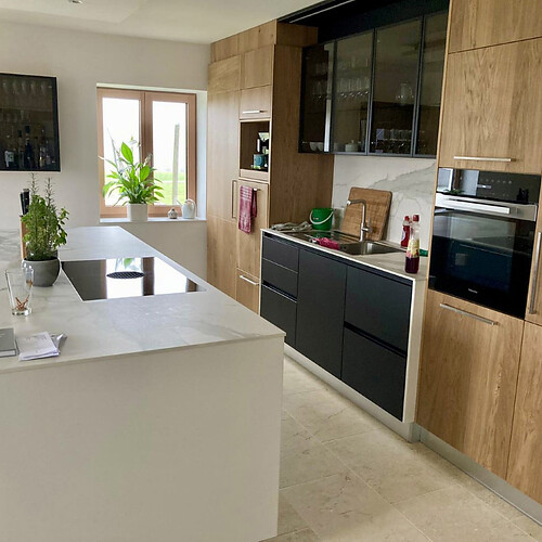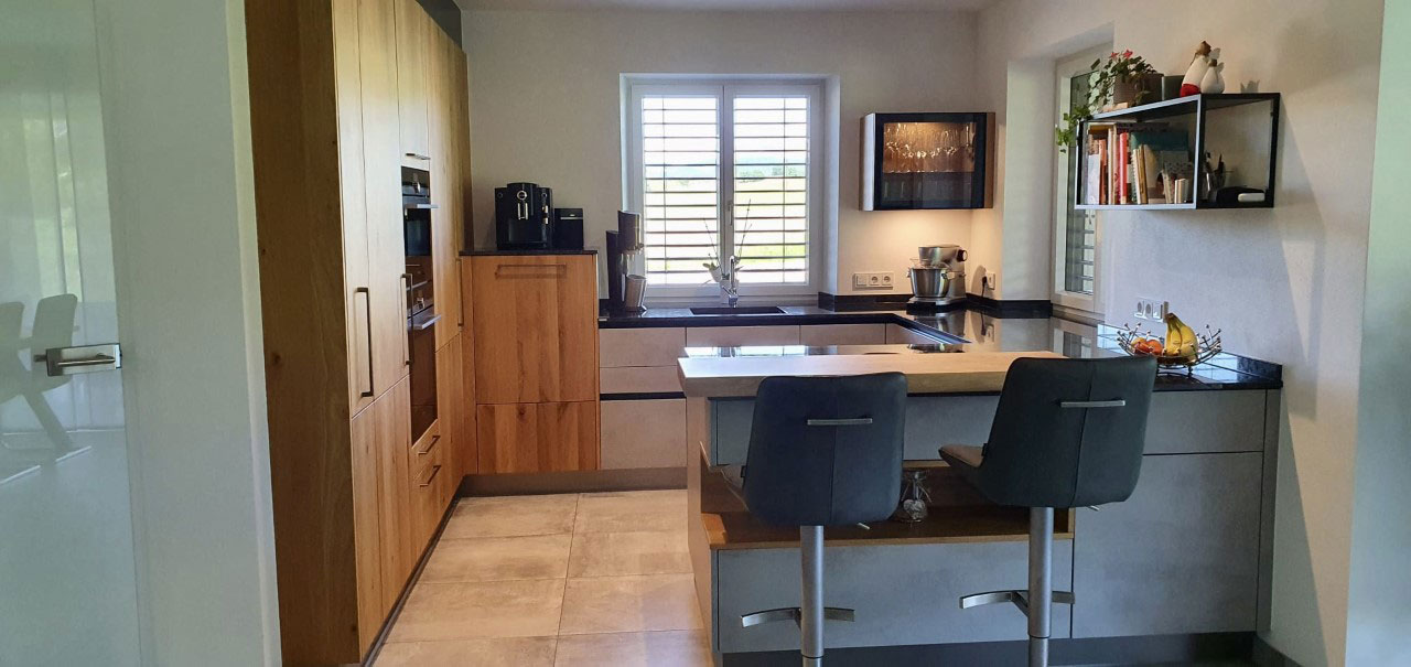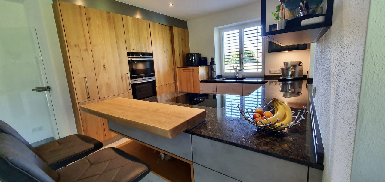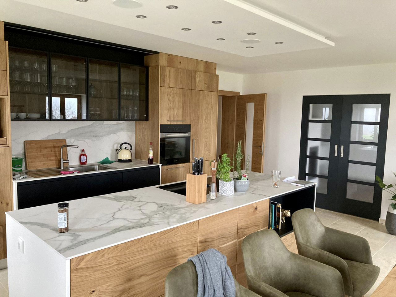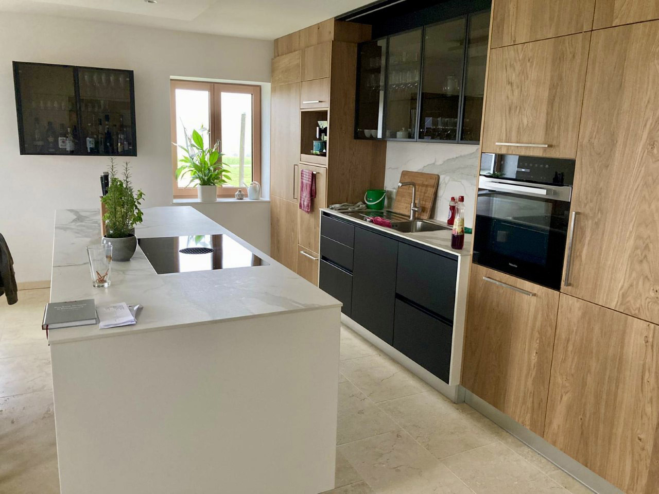Asteiche natur kombiniert mit einer edlen matten Oberfläche in schwarz, Keramik Arbeitsplatte.