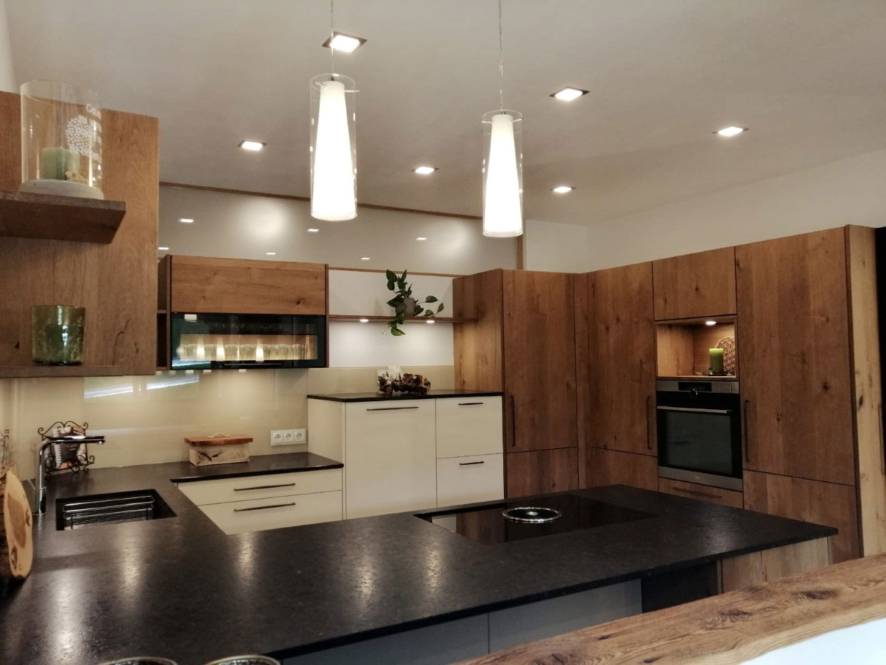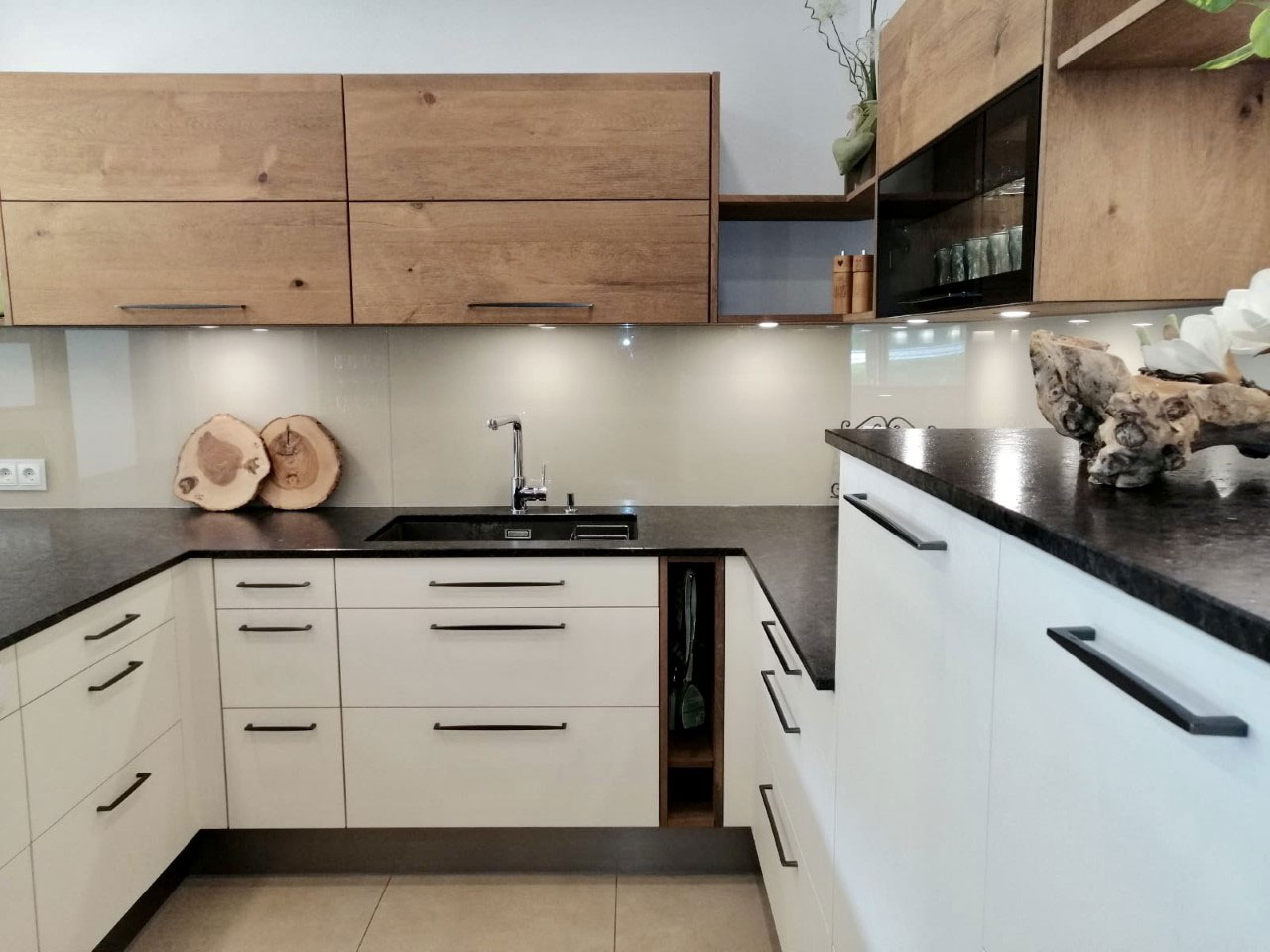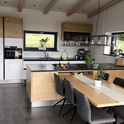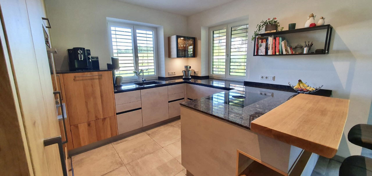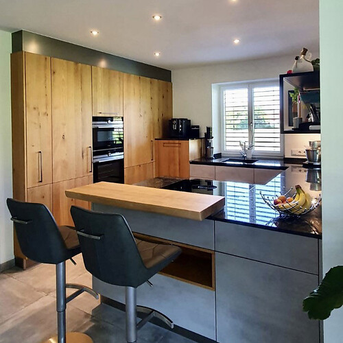 Asteiche natur kombiniert mit einer edlen matten Oberfläche in schwarz, Keramik Arbeitsplatte.
