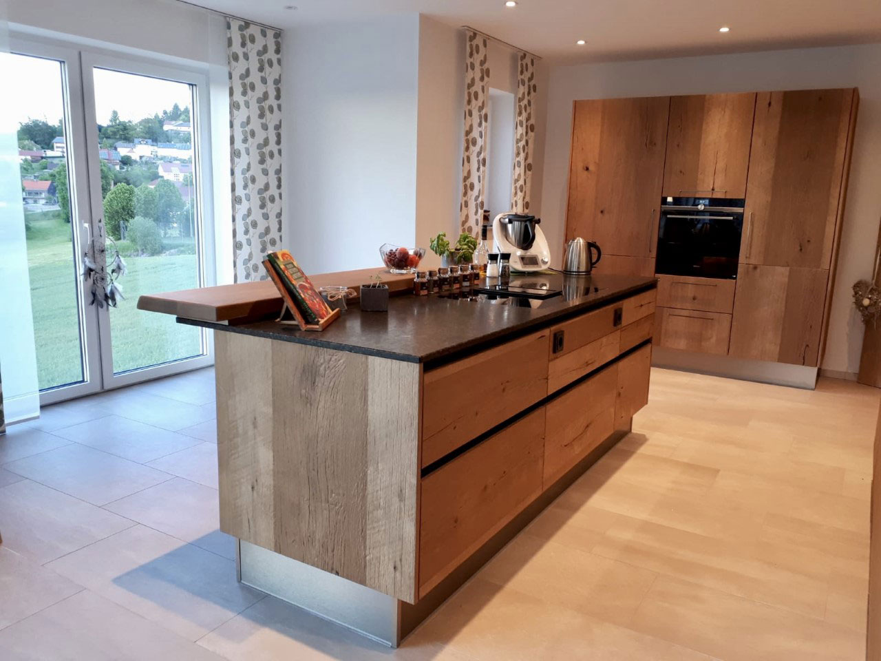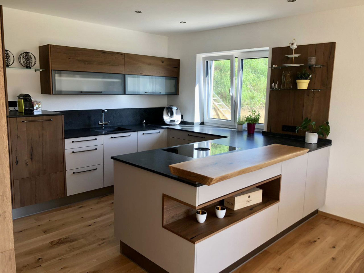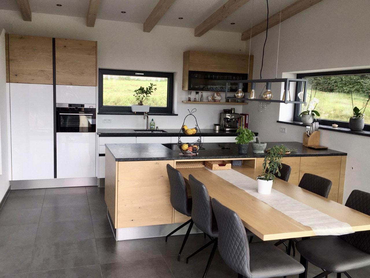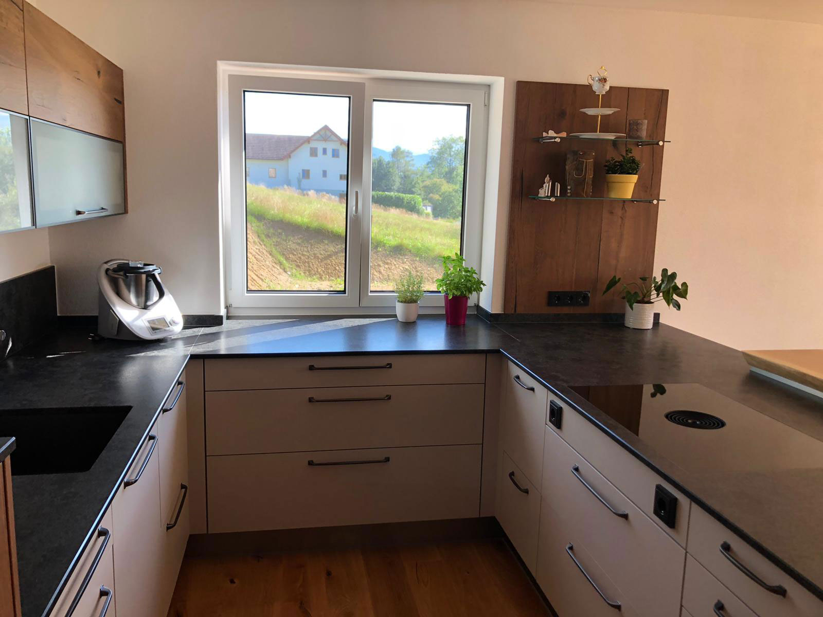 Asteiche natur kombiniert mit einer edlen matten Oberfläche in schwarz, Keramik Arbeitsplatte.