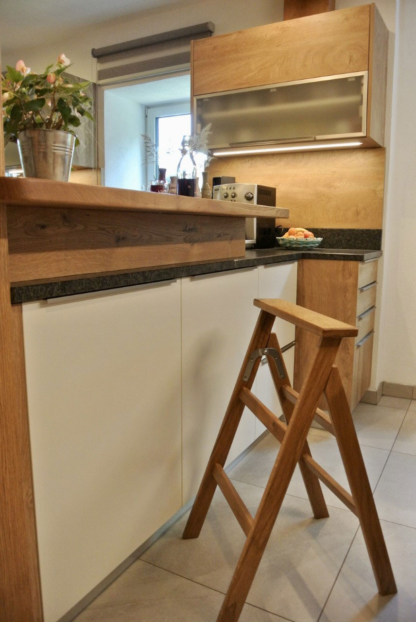Asteiche natur mit weißer Front und heller Steinarbeitsplatte.