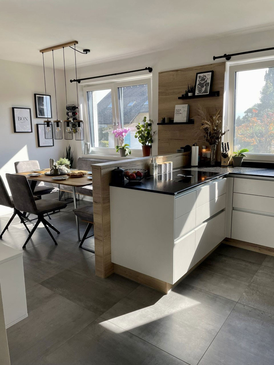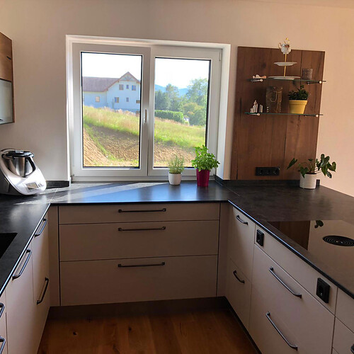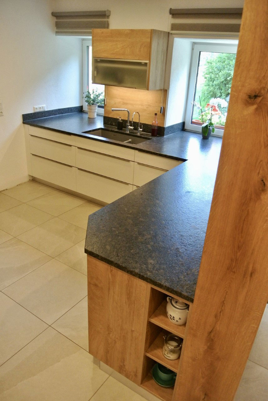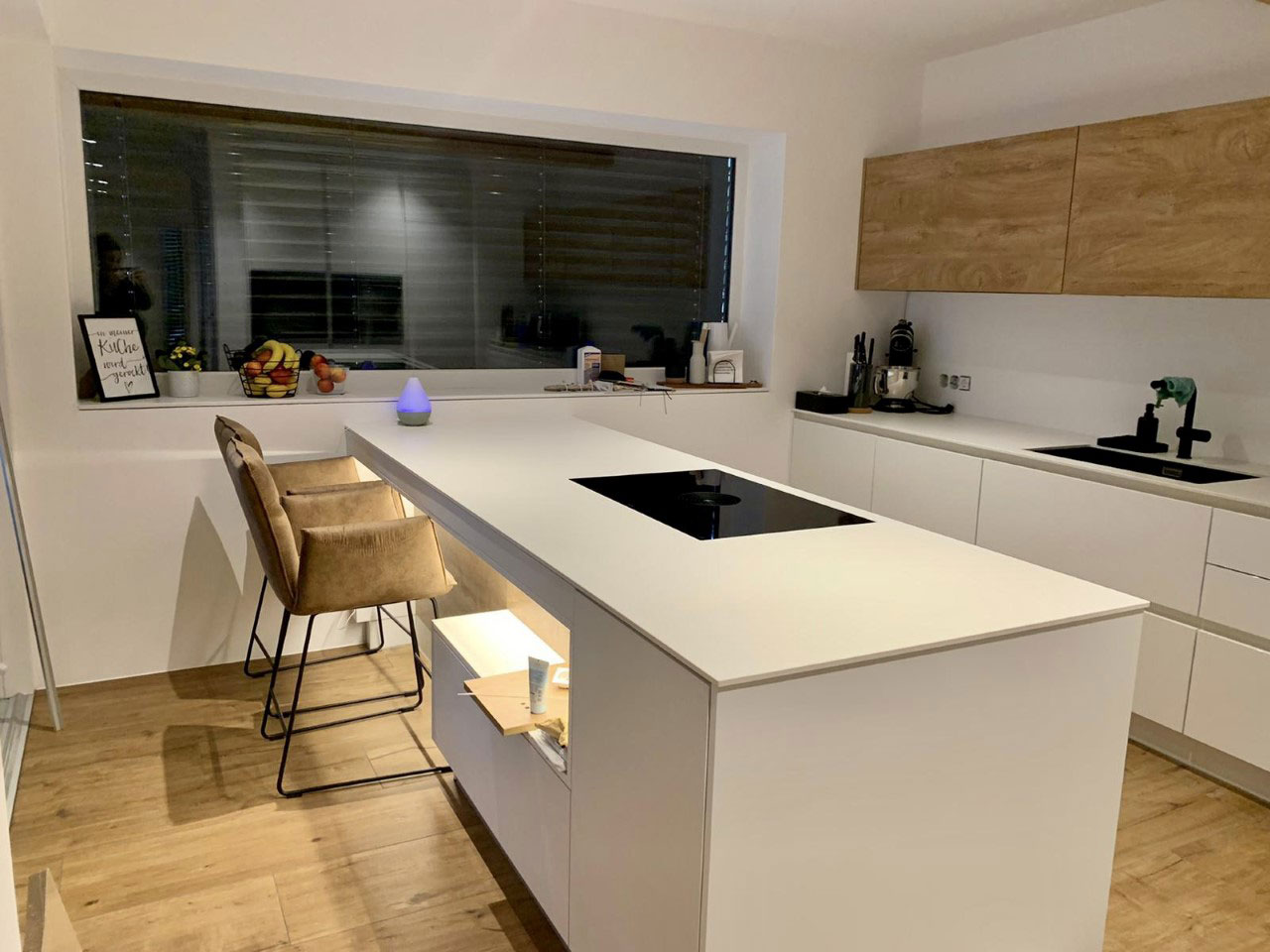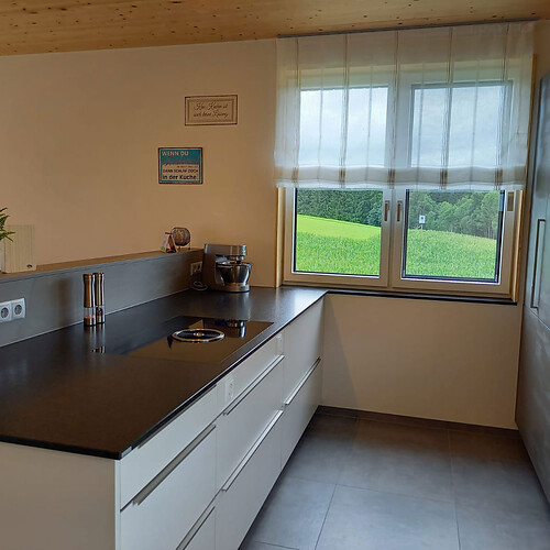 Helle weiße Front mit Schieferoptik kombiniert und dunkler Steinplatte.