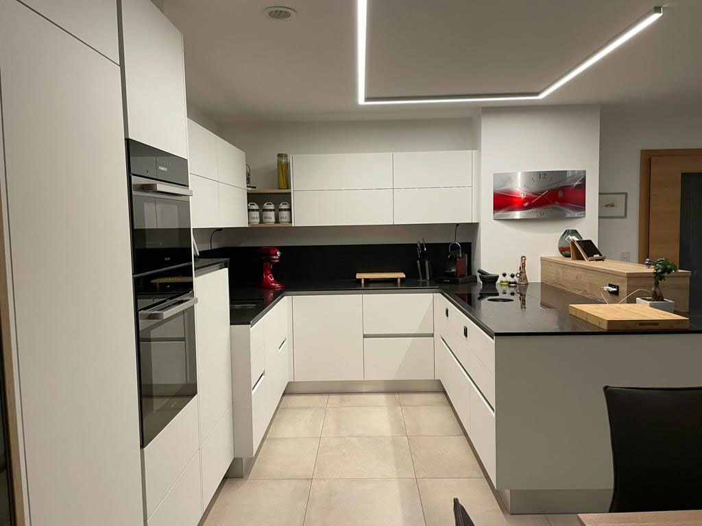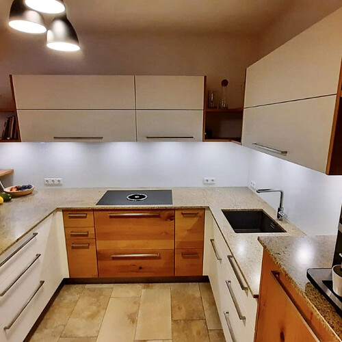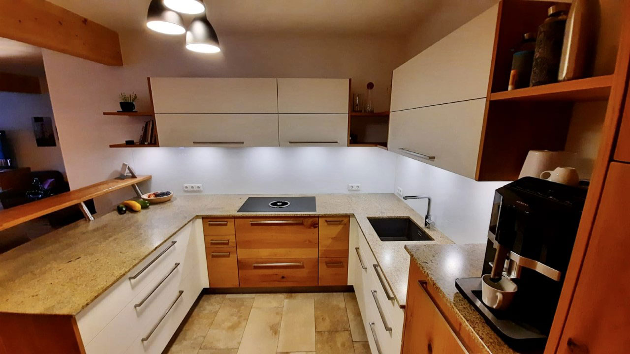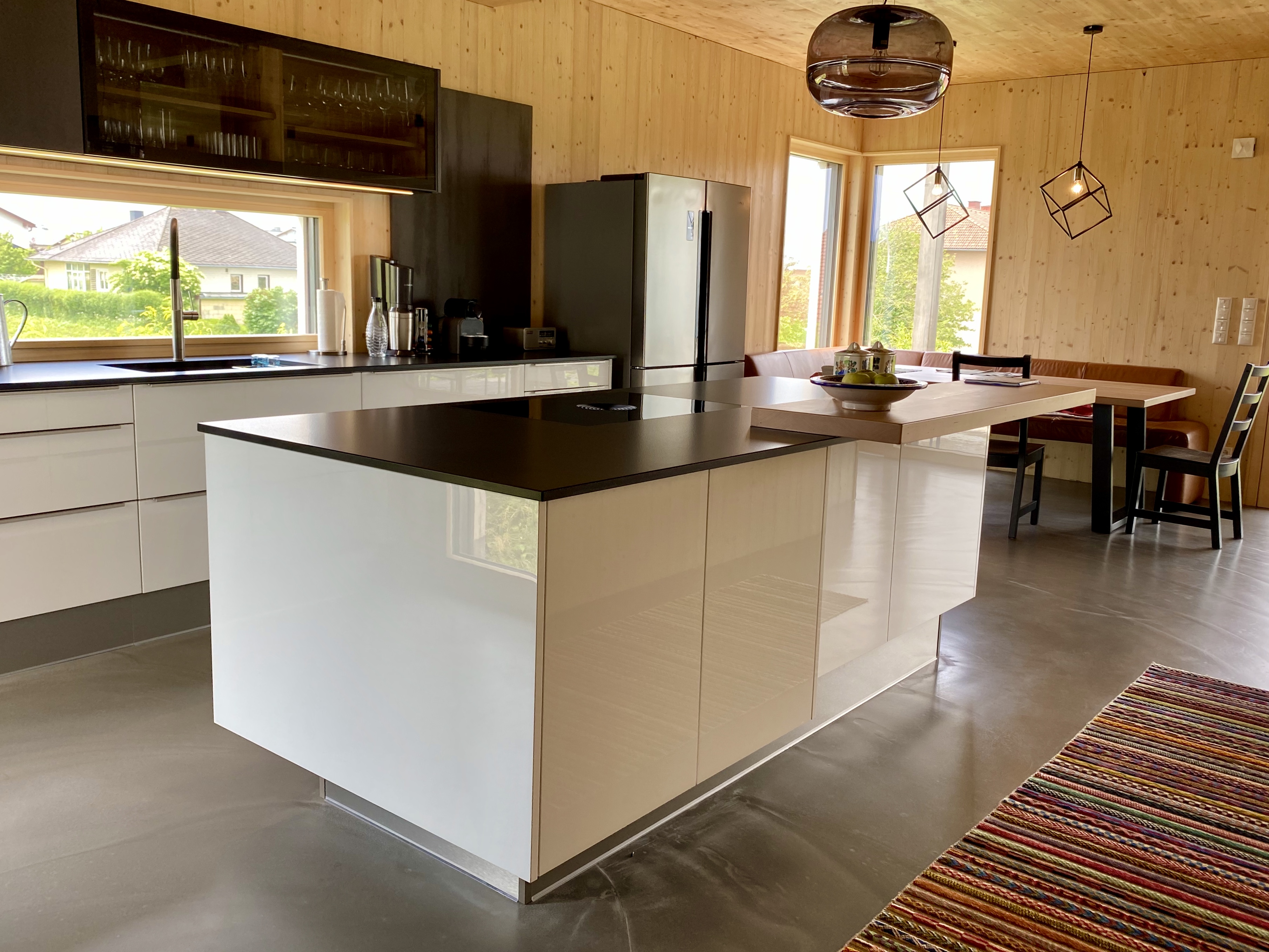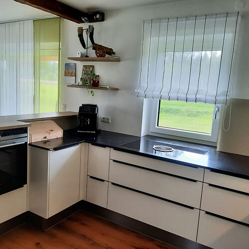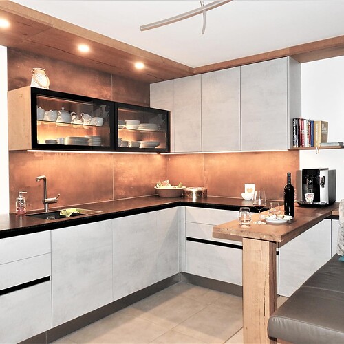 Helle weiße Front mit Schieferoptik kombiniert und dunkler Steinplatte.