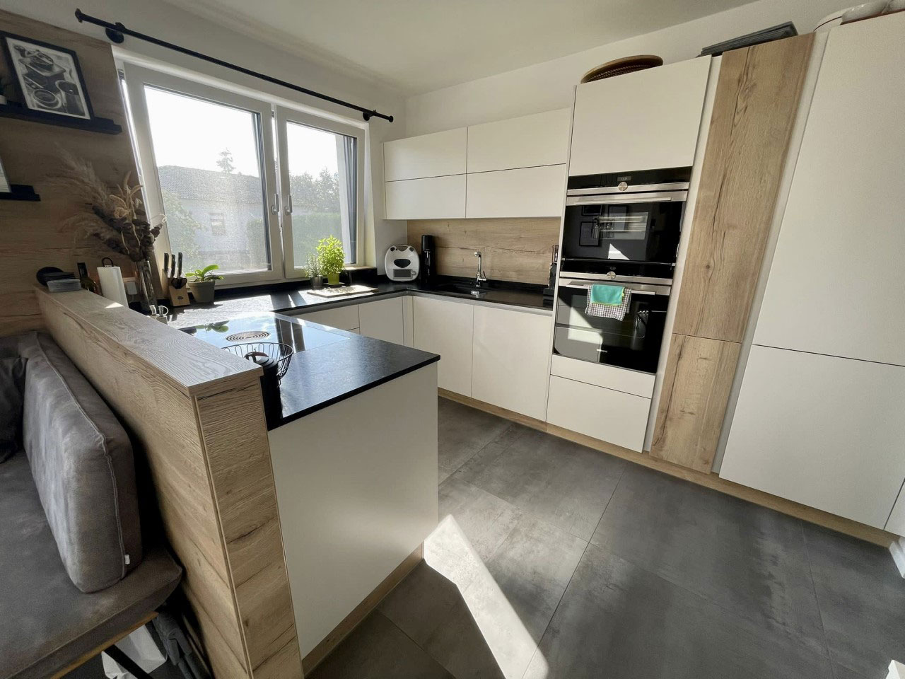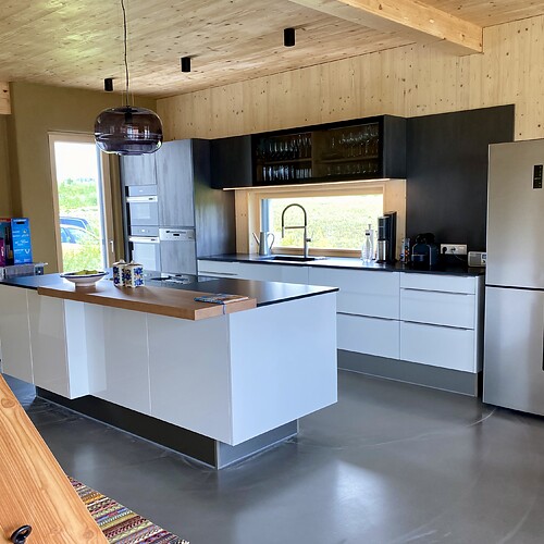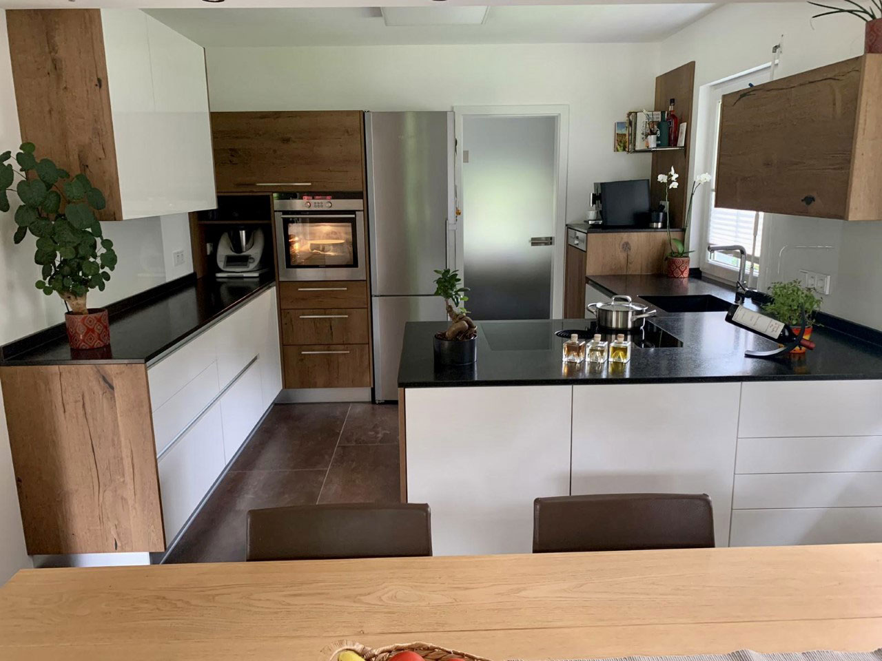 Moderne, helle Küche mit Altholzbar und Kühlschrankverbau.