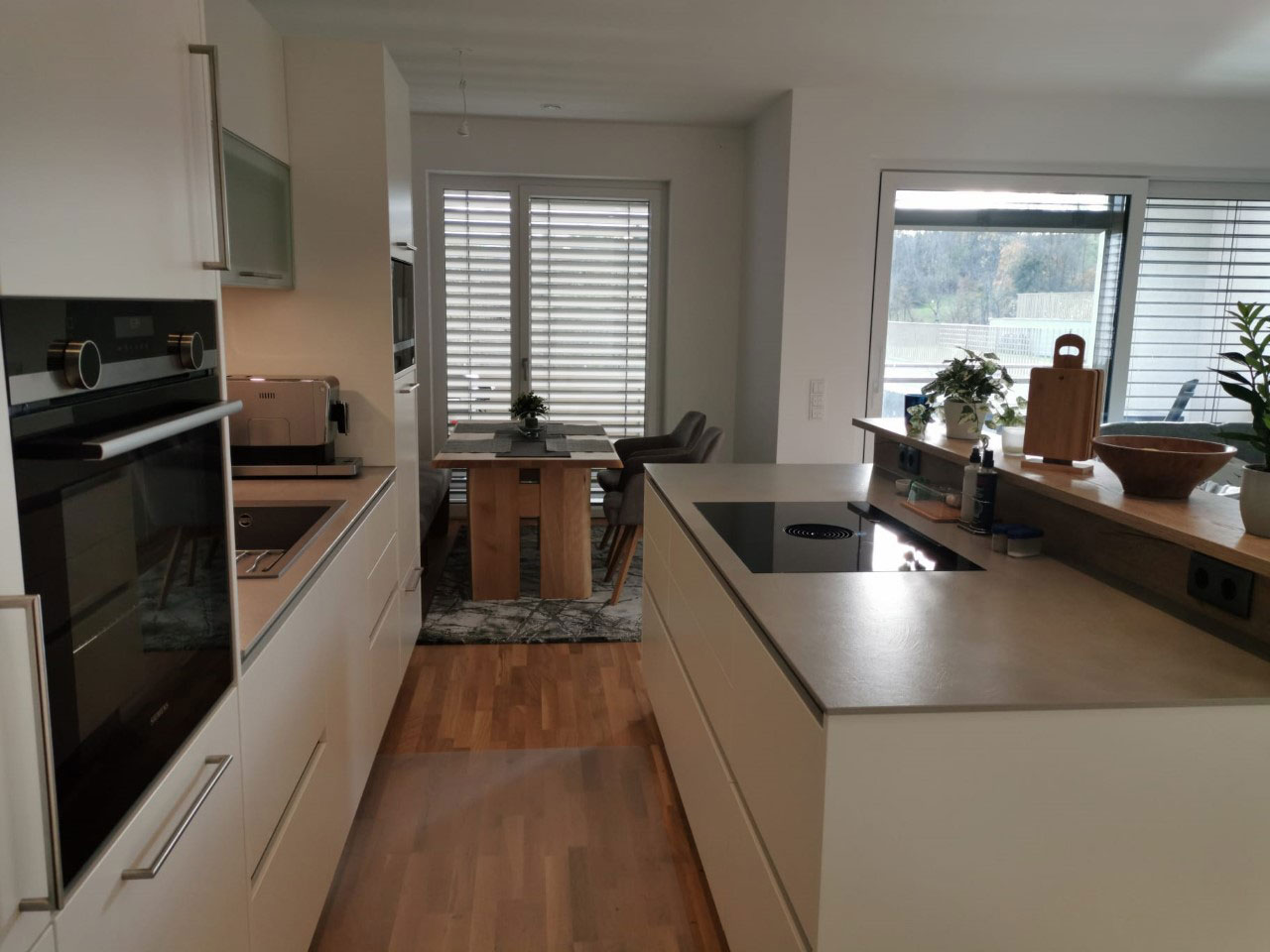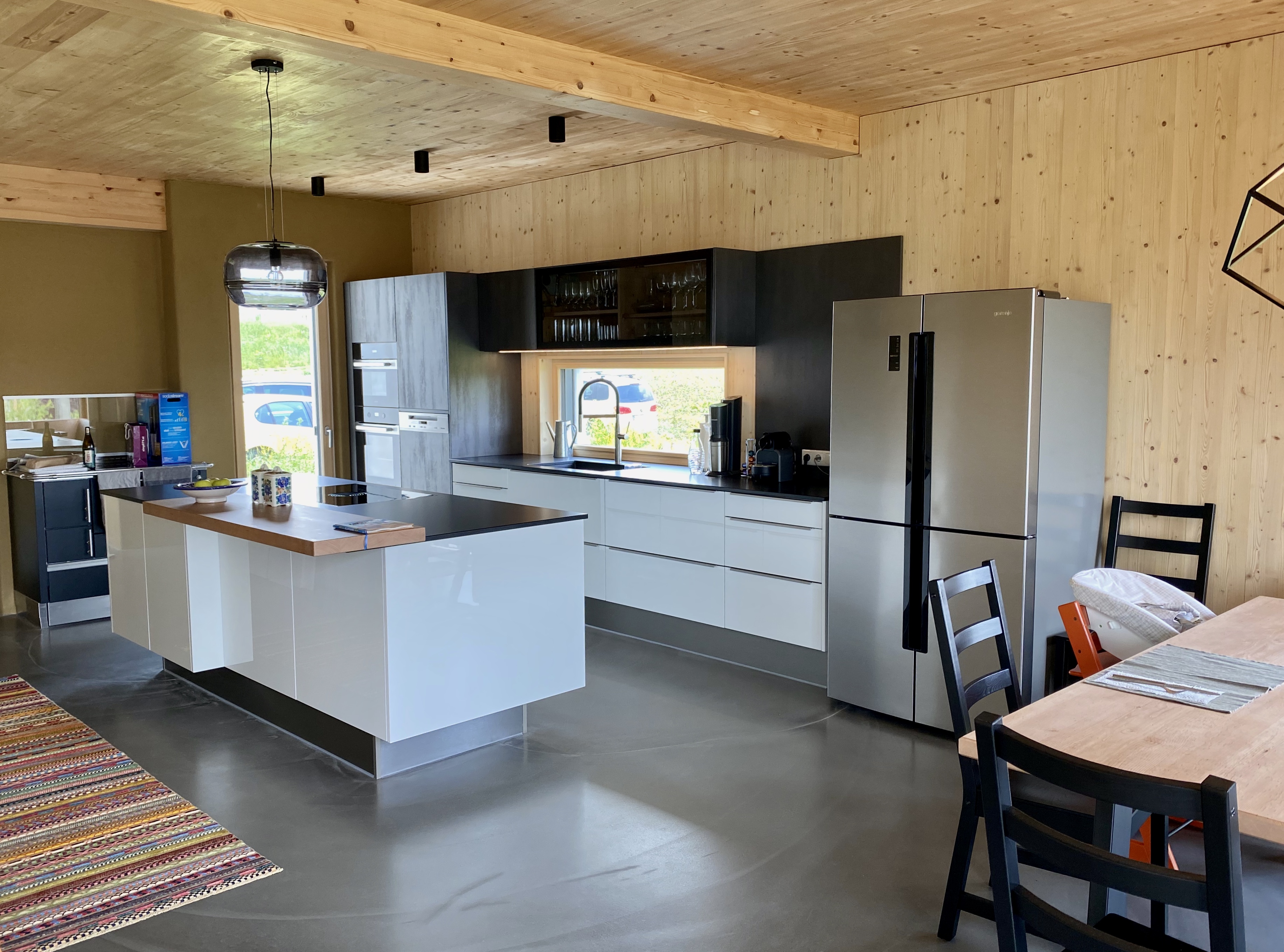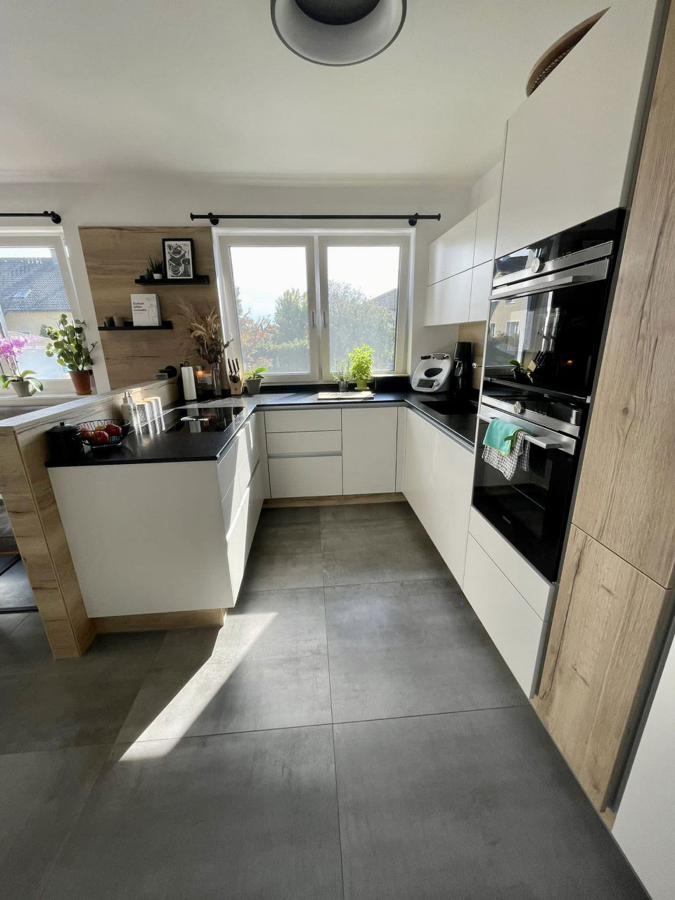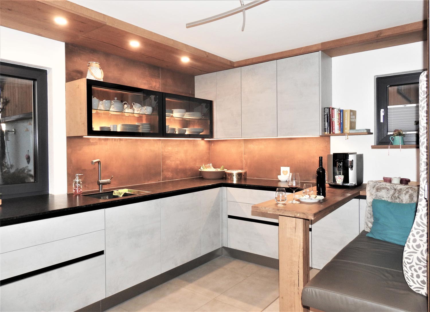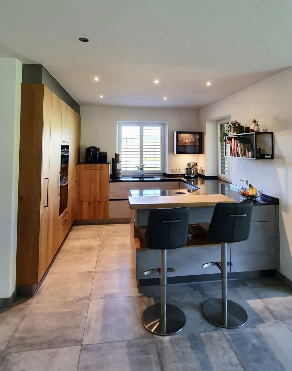 Wohnhausrenovierung, moderne Einbauküche aus Betonoptik und Altholz.