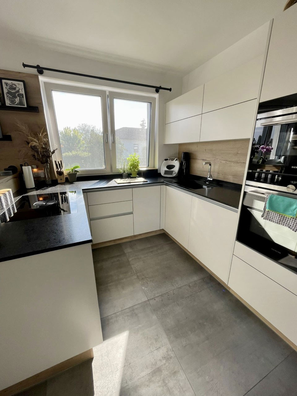 Helle, weiße Küche mit dunkler Steinarbeitsplatte
