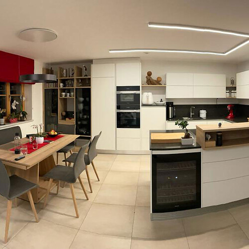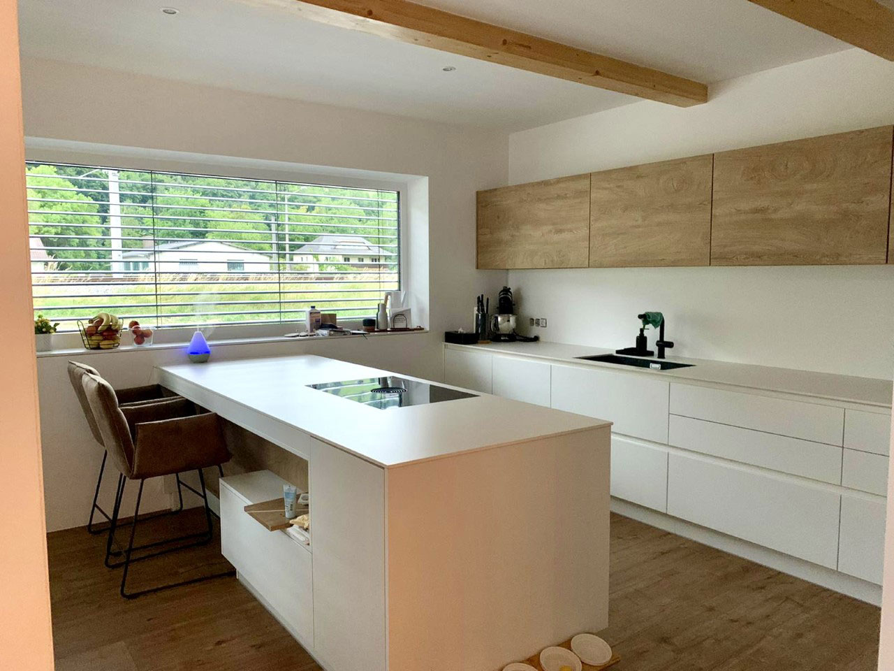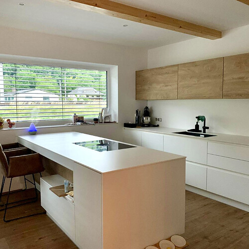 Weiße, helle Fronten mit etwas Holz abgesetzt.