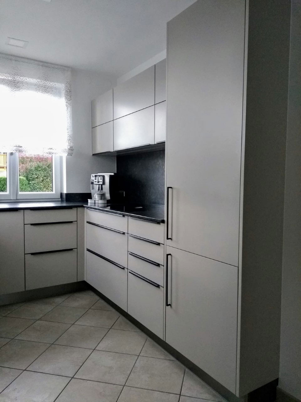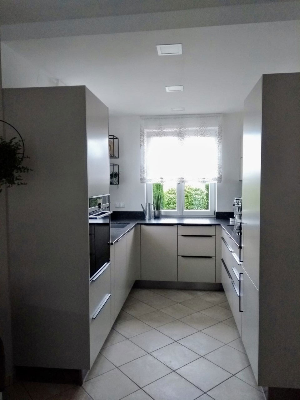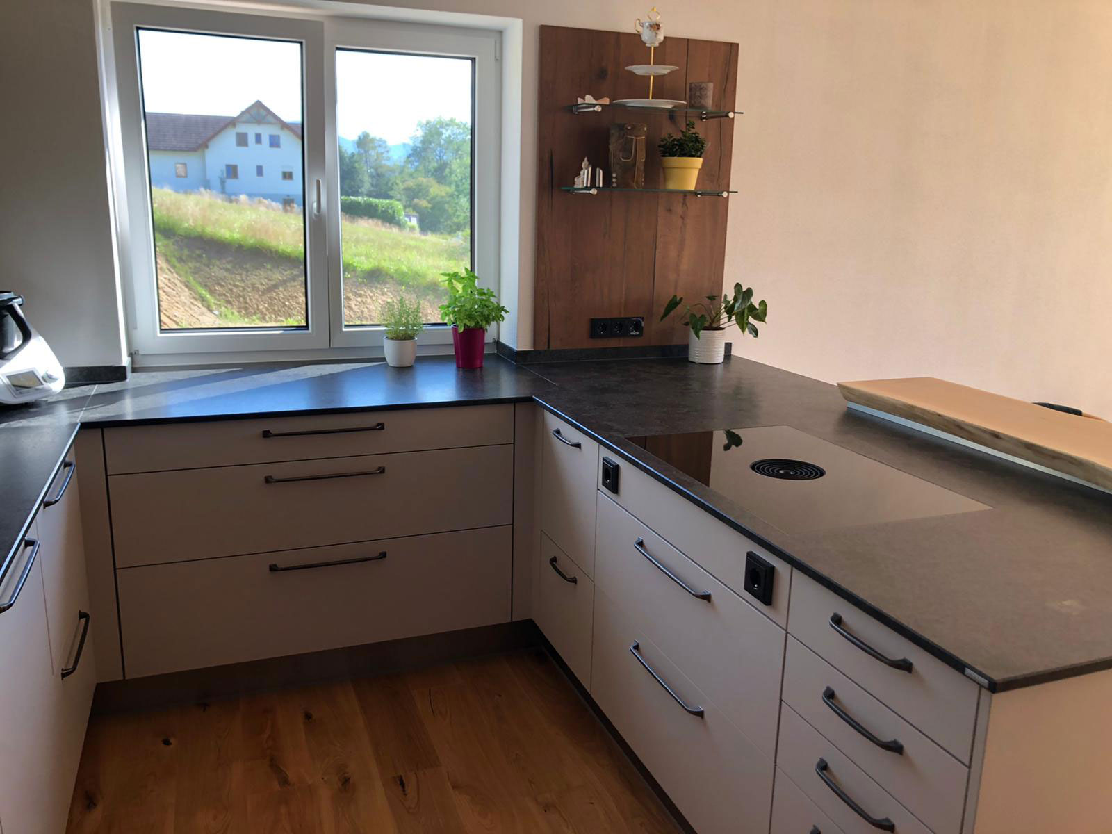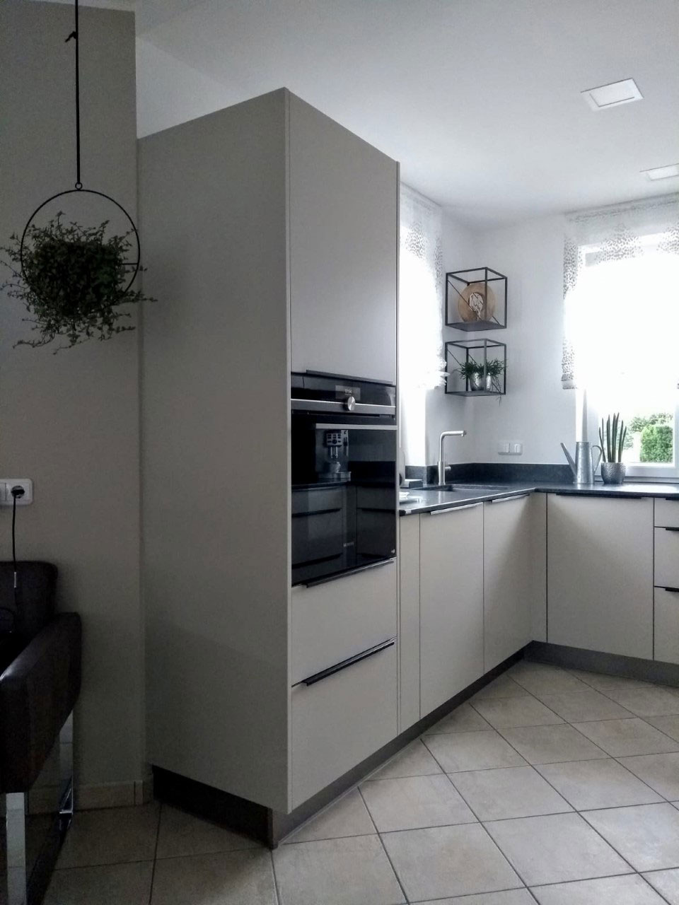 Mattlack in einem sandigen Grauton mit dunkler Stein Arbeitsplatte.