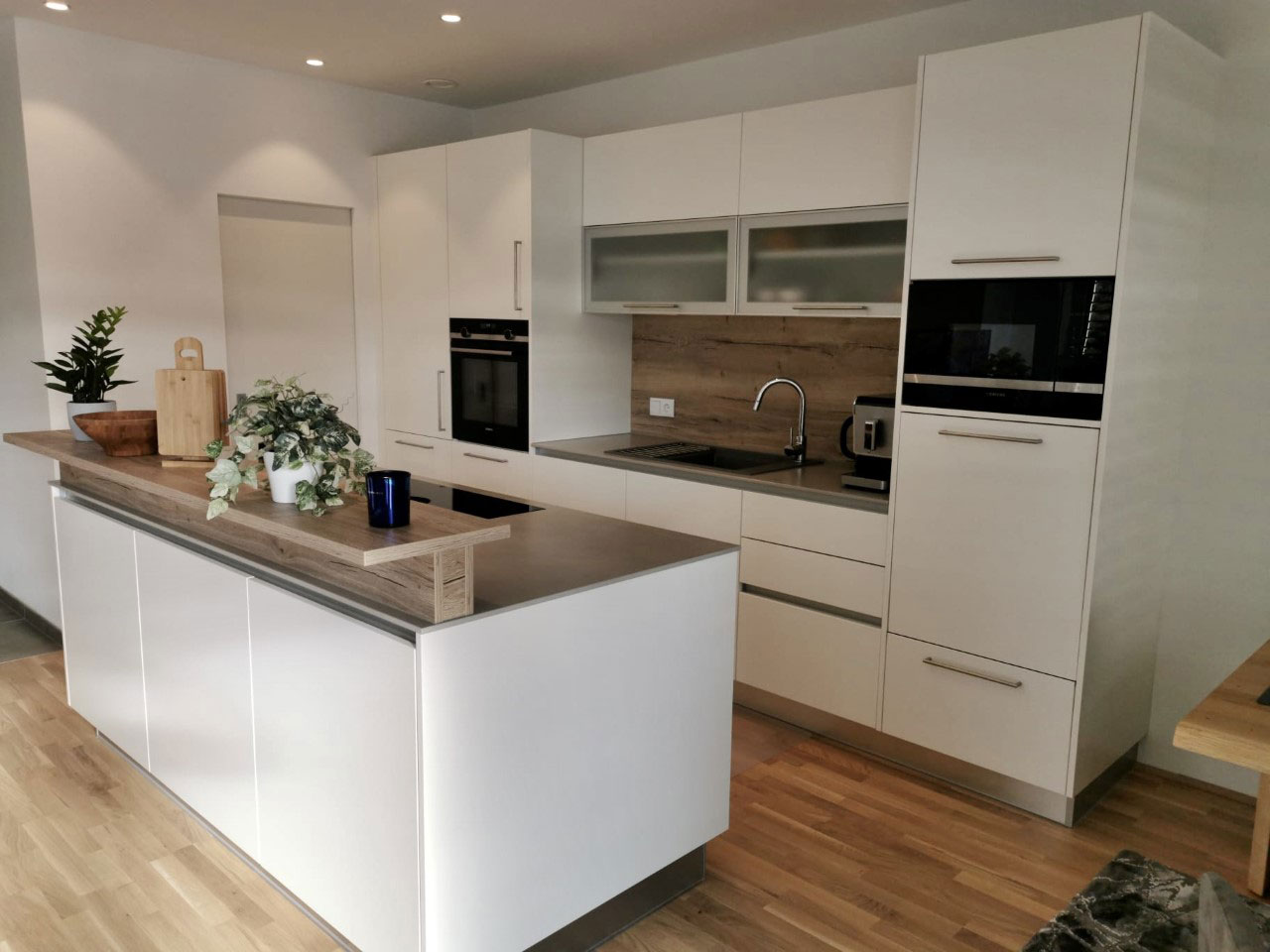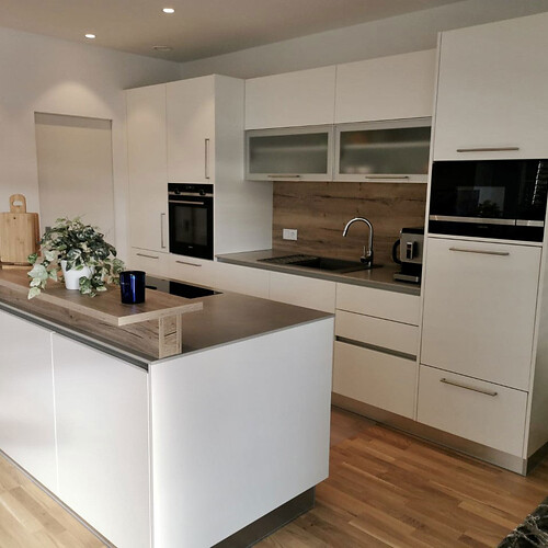 Front in Elfenbein, kombiniert mit Holzoptik.
