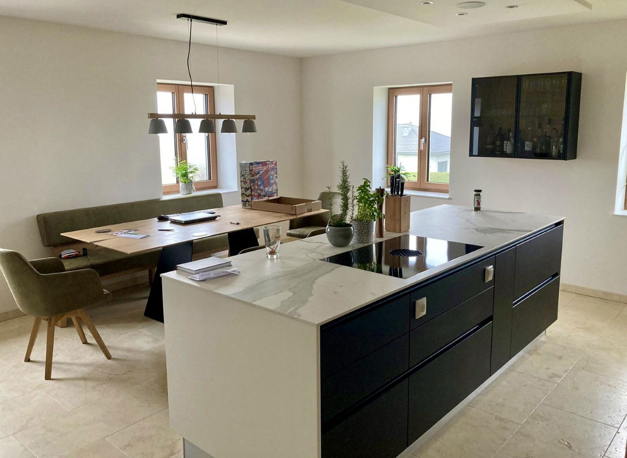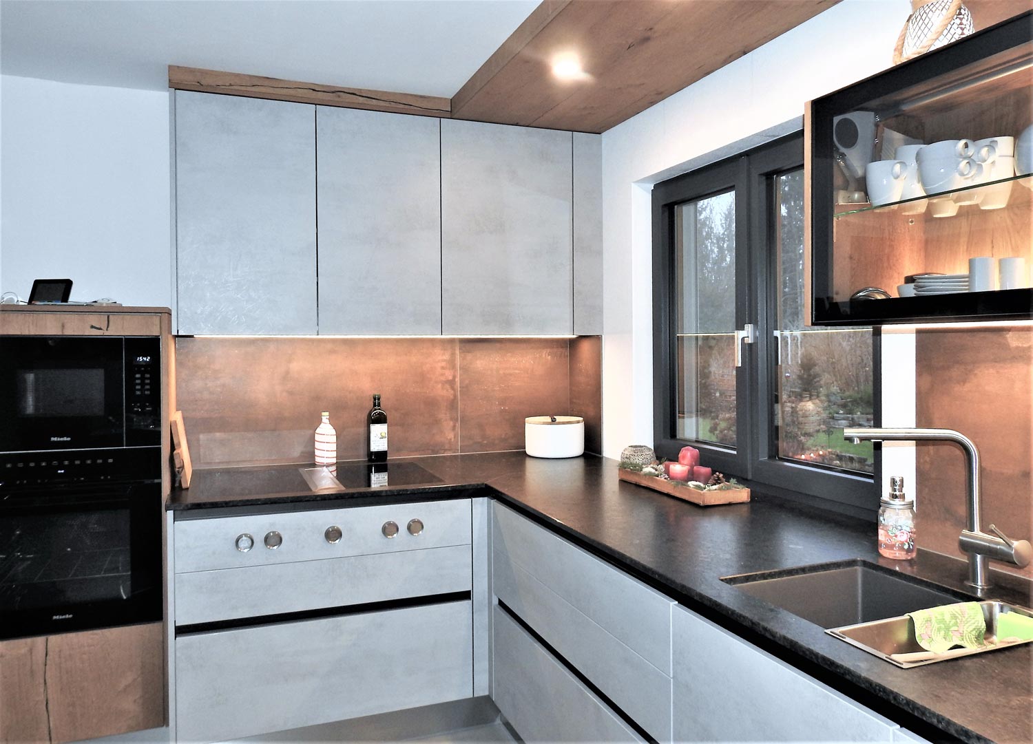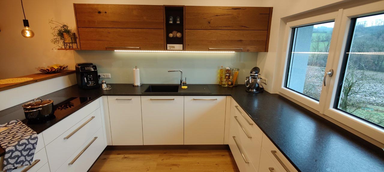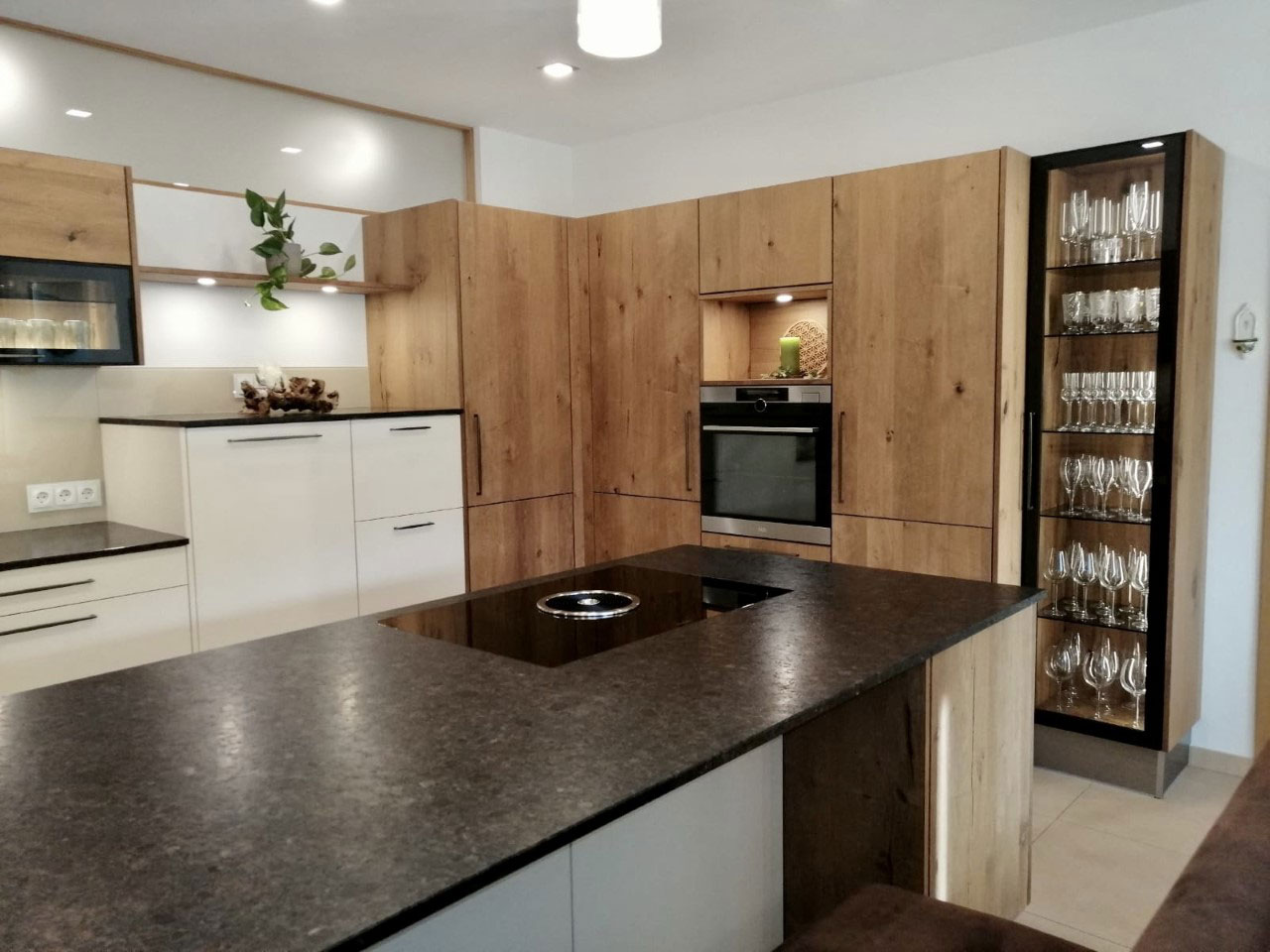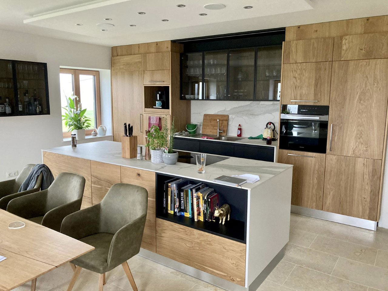 Asteiche natur kombiniert mit einer edlen matten Oberfläche in schwarz, Keramik Arbeitsplatte.