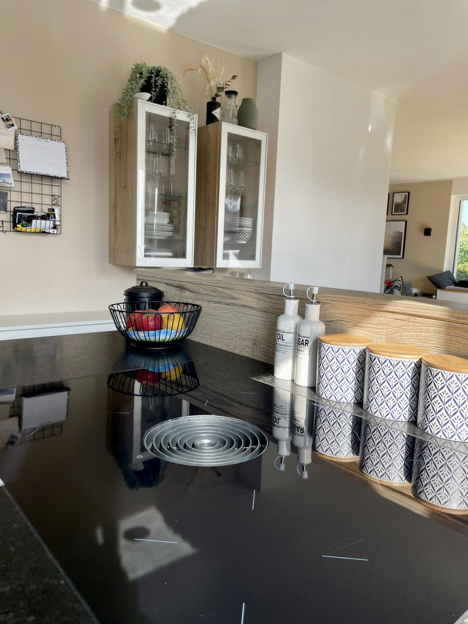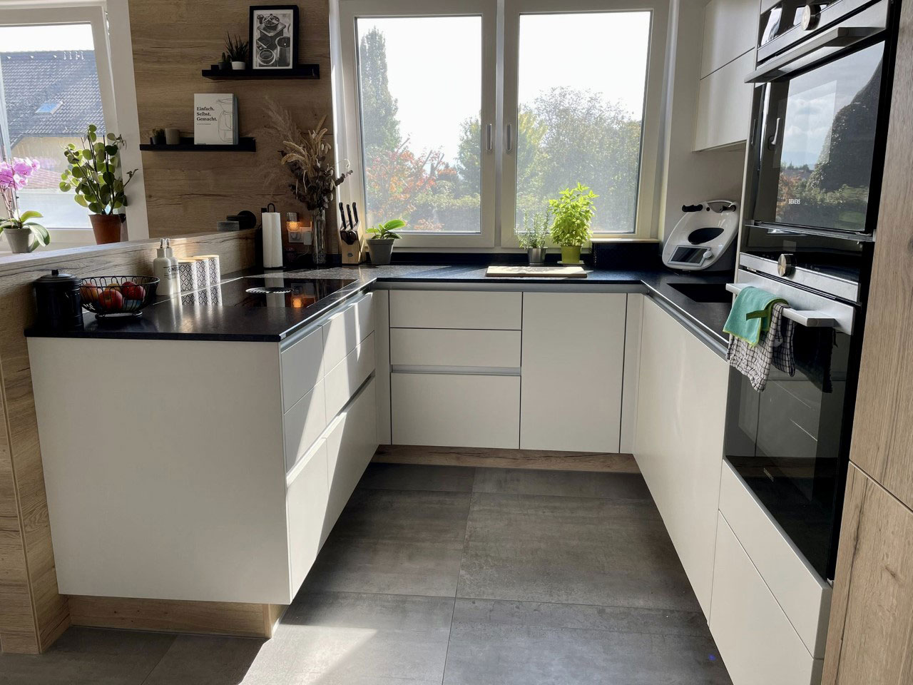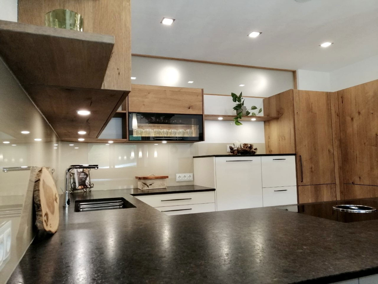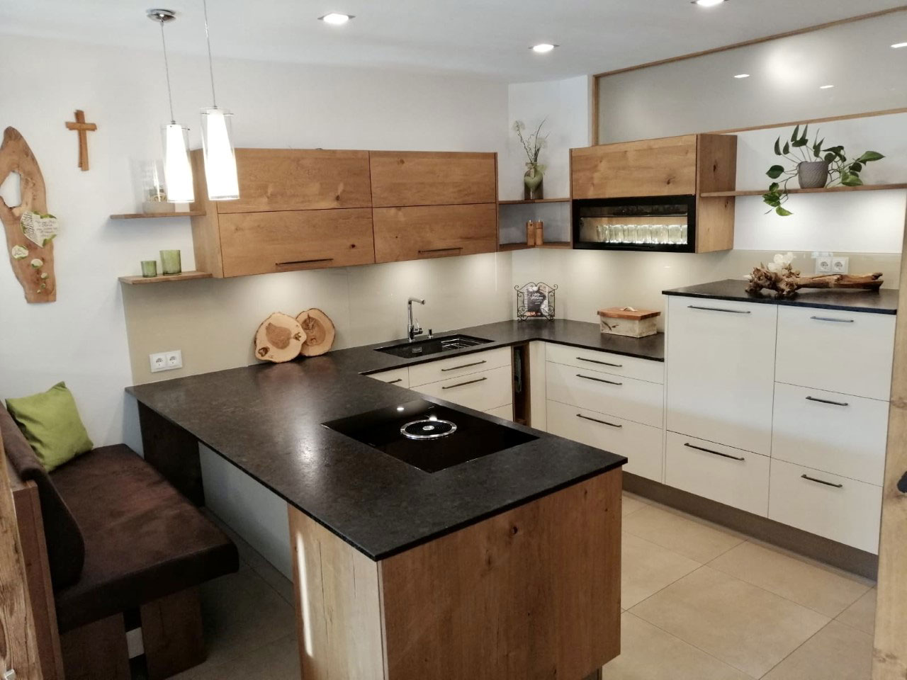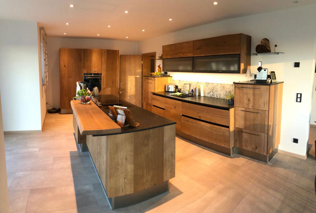 Asteiche natur kombiniert mit einer edlen matten Oberfläche in schwarz, Keramik Arbeitsplatte.