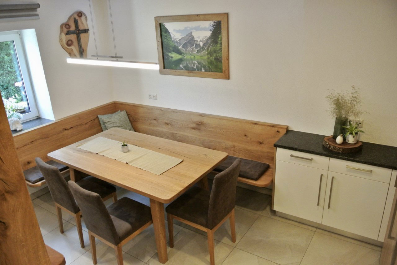 Gemütlicher Sitzplatz mit Bankteil zum Verweilen.