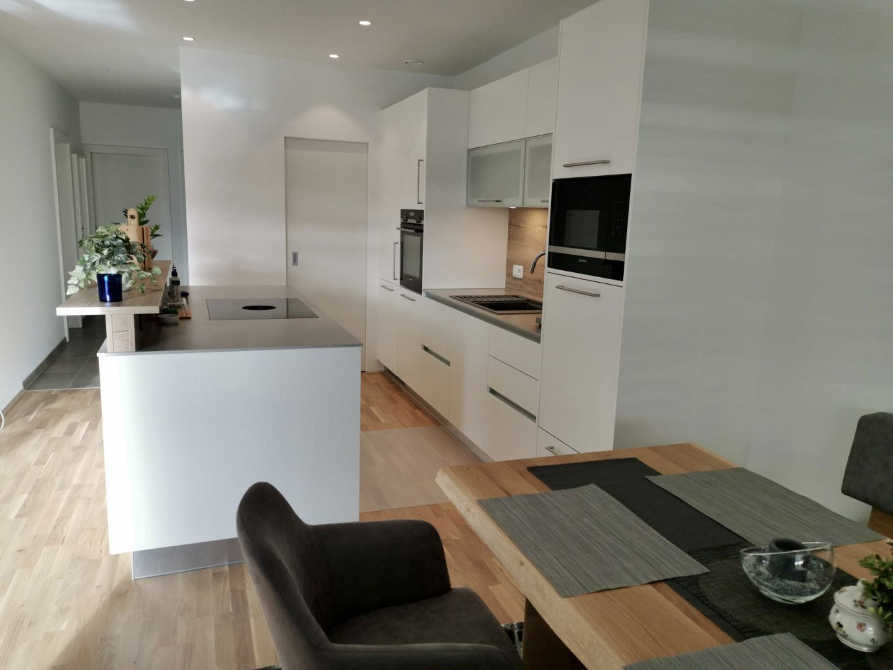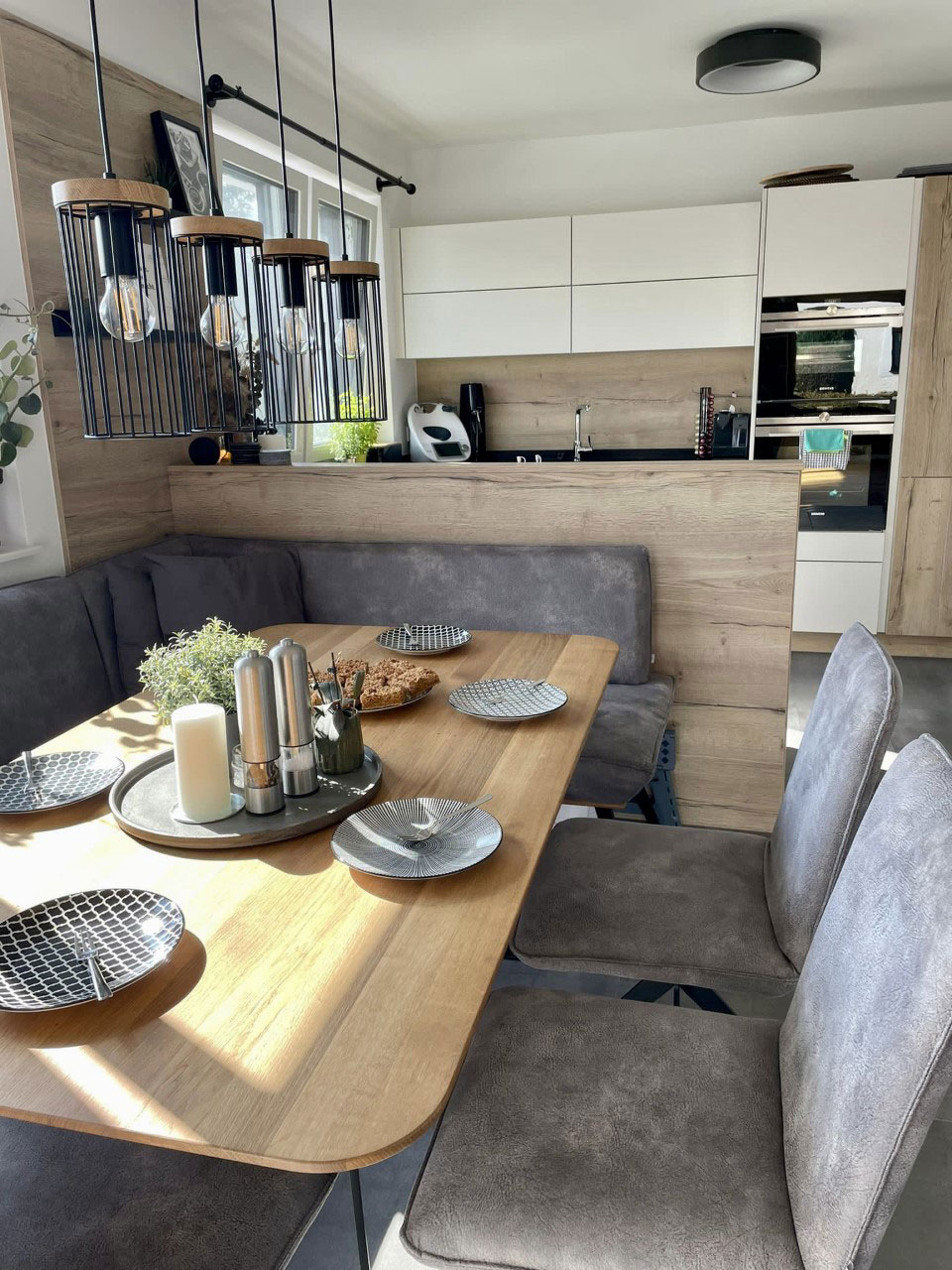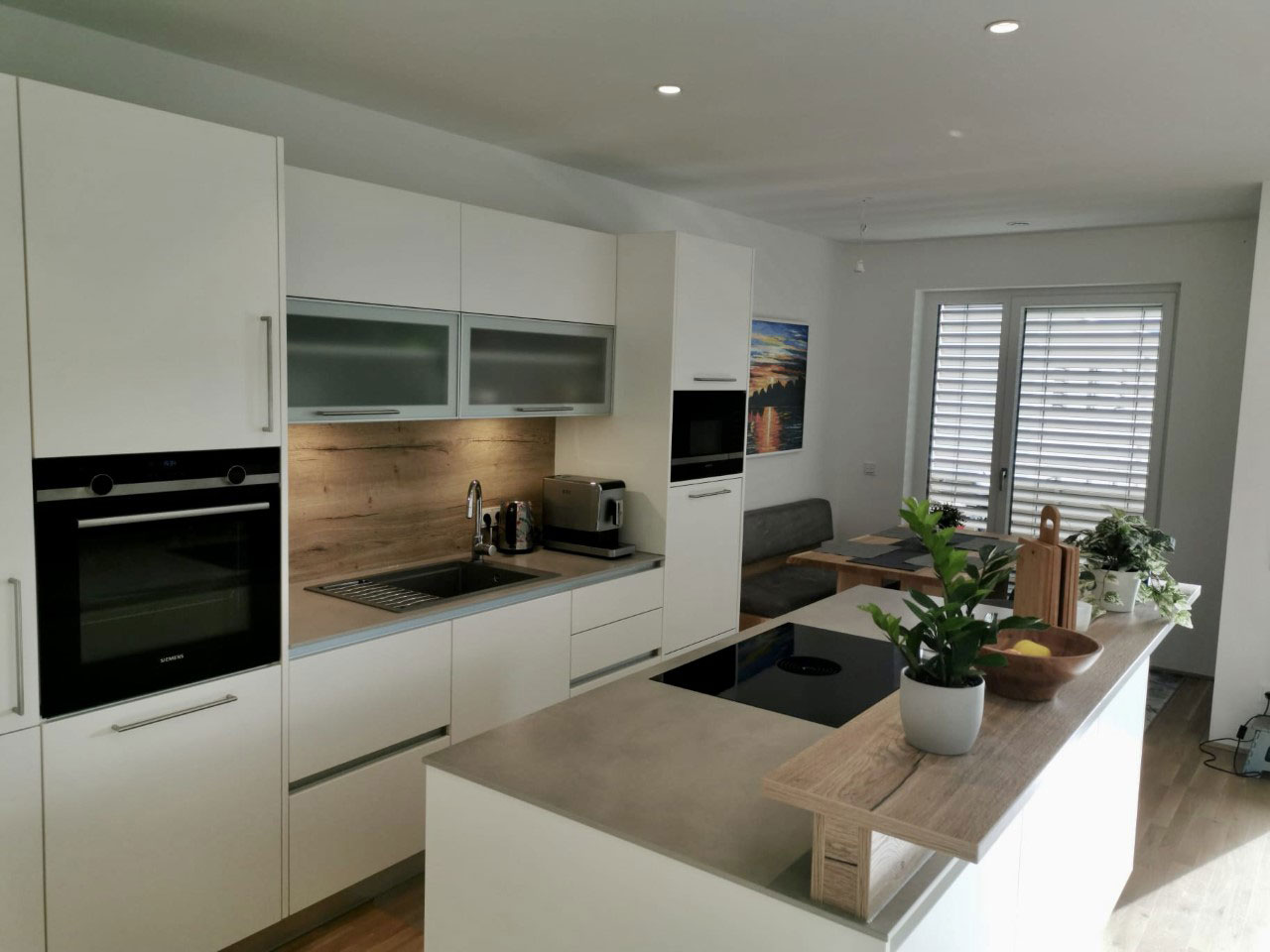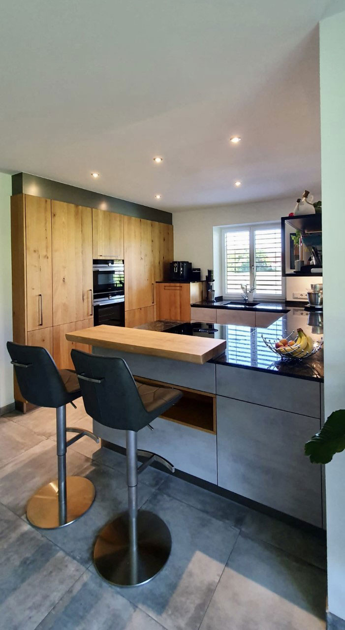 Wohnhausrenovierung, moderne Einbauküche aus Betonoptik und Altholz.