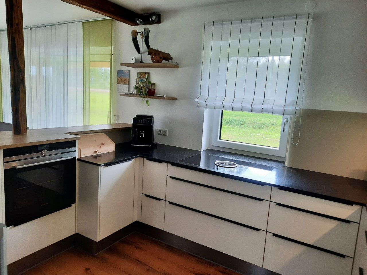 Helle, weiße Küche mit dunkler Steinarbeitsplatte