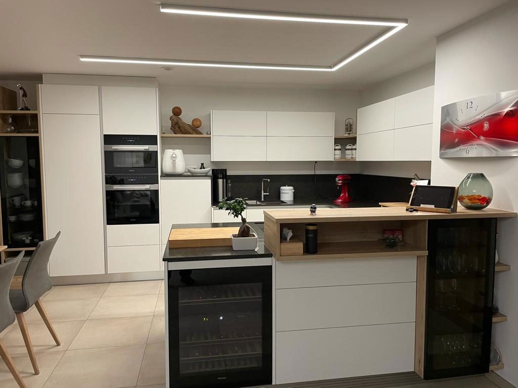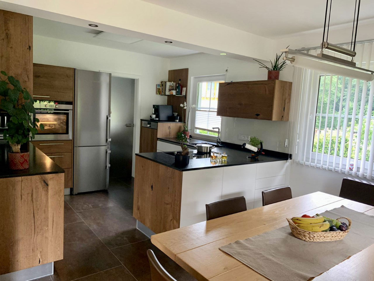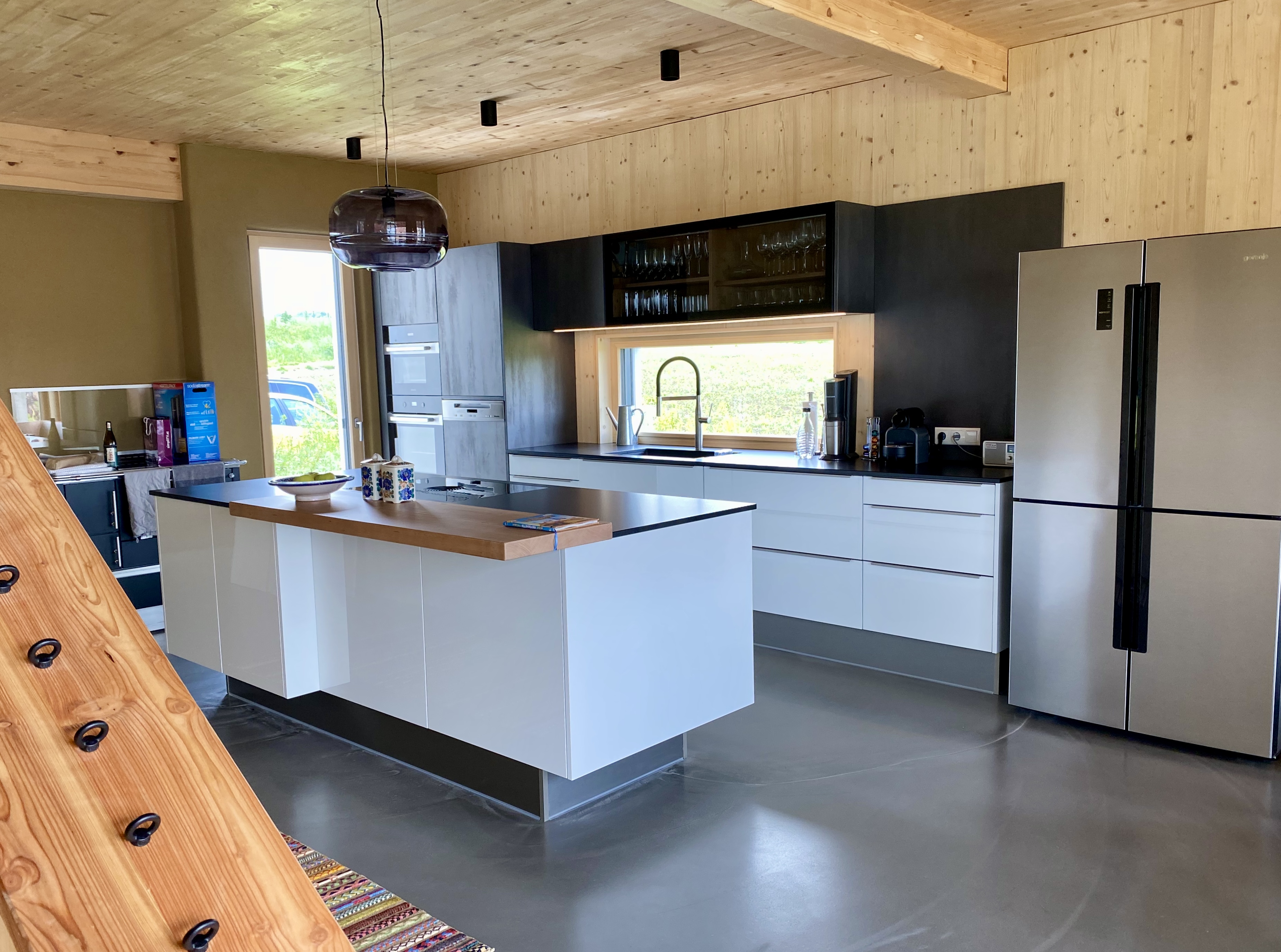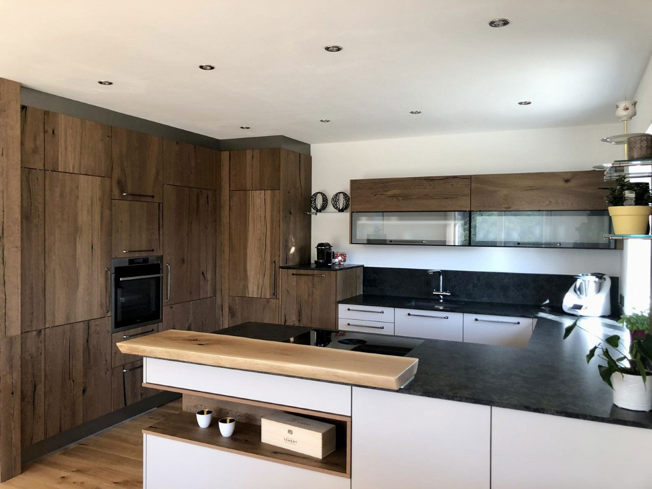 Moderne, helle Küche mit Altholzbar und Kühlschrankverbau.