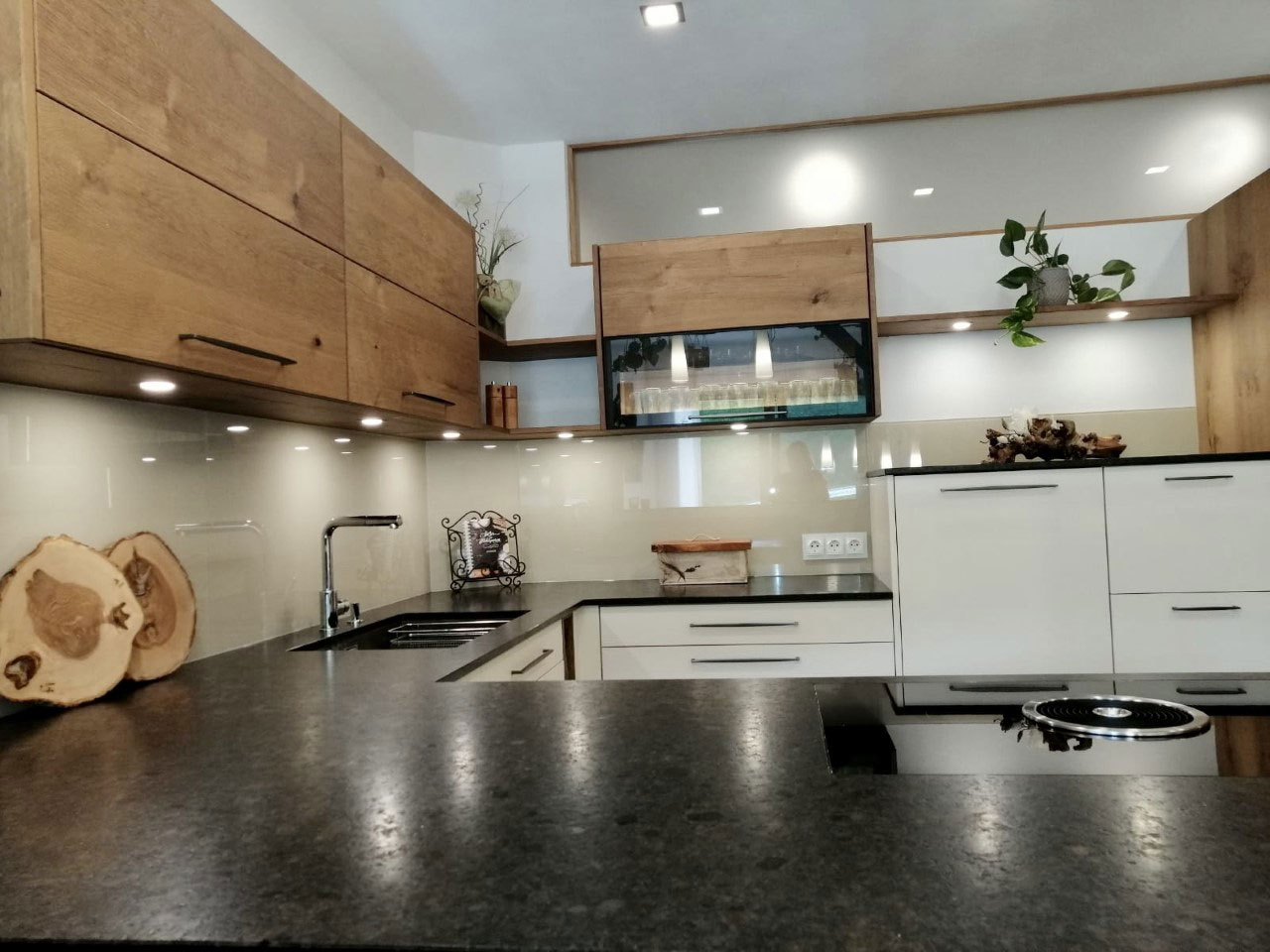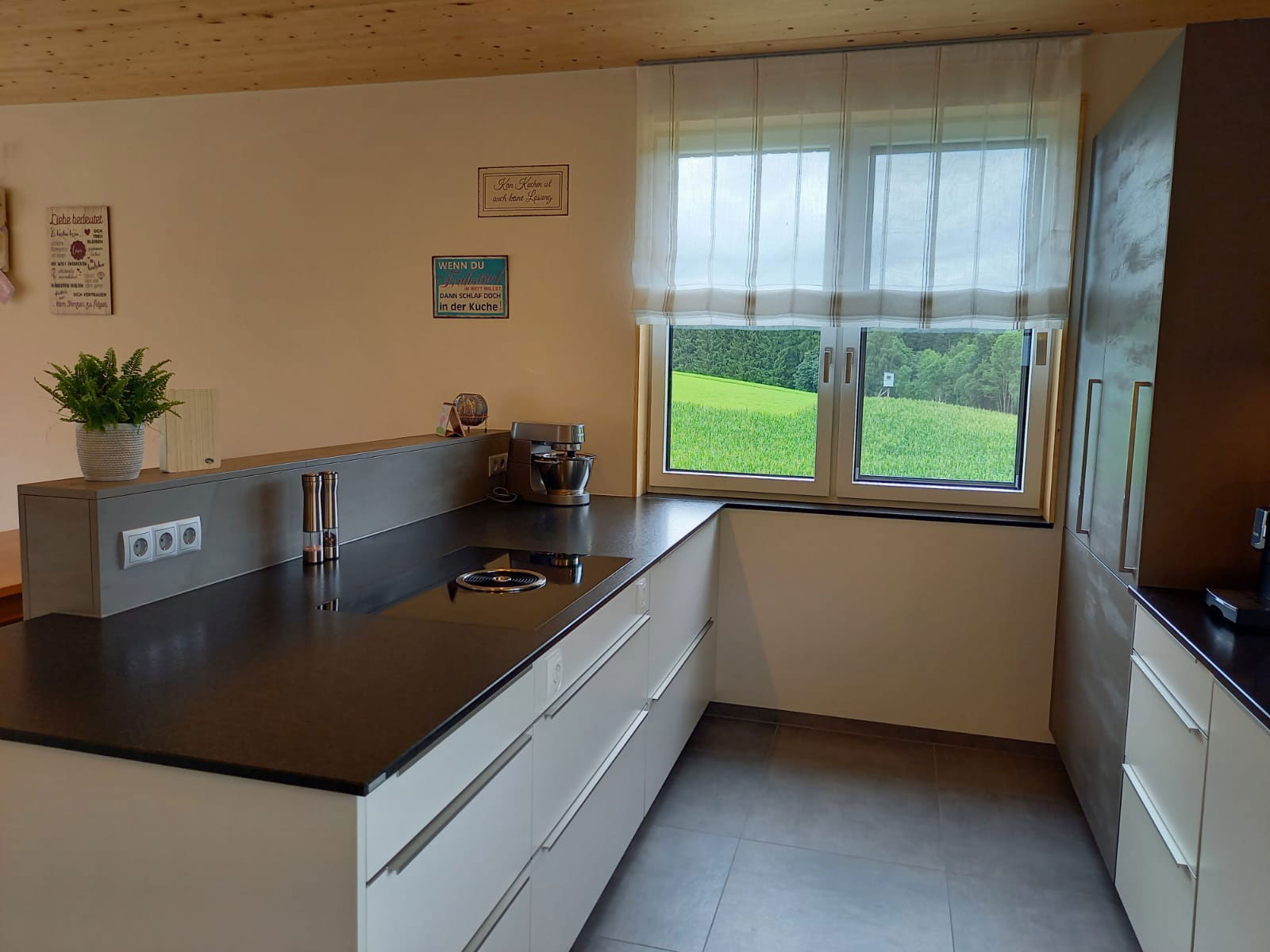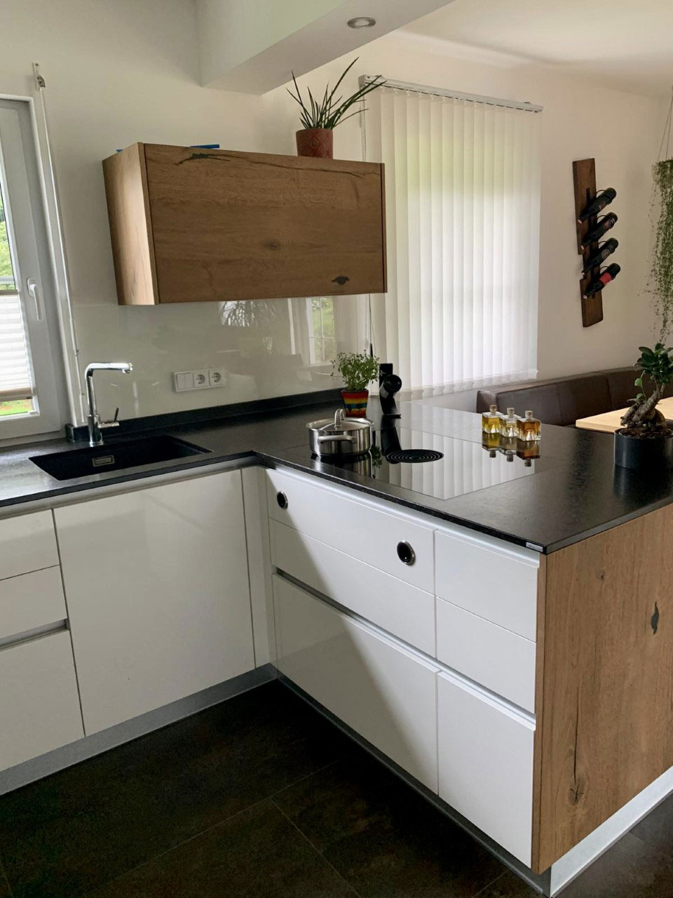Helle weiße Front mit Schieferoptik kombiniert und dunkler Steinplatte.